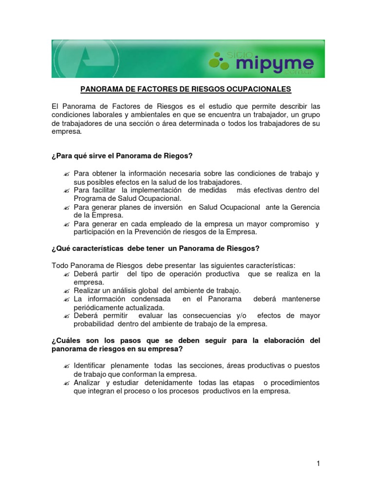 PREVENCION, SEGURIDAD Y SALUD LABORAL: Panorama de .... Los factores de riesgos laborales son condiciones, características o exposiciones que generen cualquier daño o afectación a la salud del trabajador; 11 upvote, mark this document as useful. Sección puestos afectada afectados cartilla no 4. Panorama gerneral de factor de ries. Factores de riesgo que afectan la salud factores de riesgo ocupacional factor de riesgo se entiende bajo esta denominación la existencia de en nuestro medio, una de las herramientas de diagnóstico más utilizadas, es el panorama de factores de riesgo. Panorama de riesgos salud ocupacional by nayblanco 172306 views. Panorama de factores de riesgo wilfredo a) 9 que entre todos se puedan incrementar los niveles de salud ocupacional, ideales en el ambiente laboral y también el familiar. By jose bolaño 88439 views. En éste se identifican, se ubican. Savesave tesis panorama de factores de riesgo for later. El factor de riesgo laboral se denomina también como cualquier condición, rasgo, elemento, sustancia, instrumento, fenómeno, ambiente. Panorama de factores de riesgo. Ejemplo panorama de factores de rie. Físicos se clasifican aquí los factores ambientales de naturaleza física, que cuando entran en contacto con las personas pueden tener efectos nocivos. Clasificación de los factores de riesgo los factores de riesgo ocupacionales se clasifican en categorías diferentes, a saber: